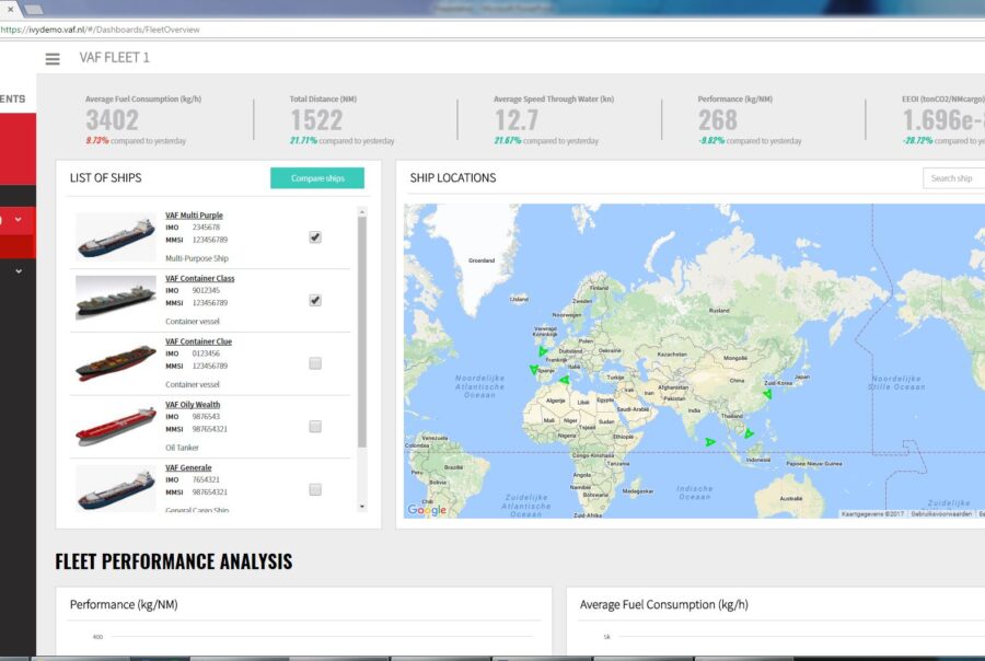 For this VAF has developed the VAF IVY®, propulsion performance monitoring solution. IVY® automatically collects all data, performs powerful analyses, visualises dedicated Key Performance Indicators (KPIs) and provides insight with full graphical display of sensor data, automated analysis reports on fuel consumption, CO2 emissions and voyage performance for any individual vessel. In addition, performance of sister vessels can easily be compared in the fleet overview.
